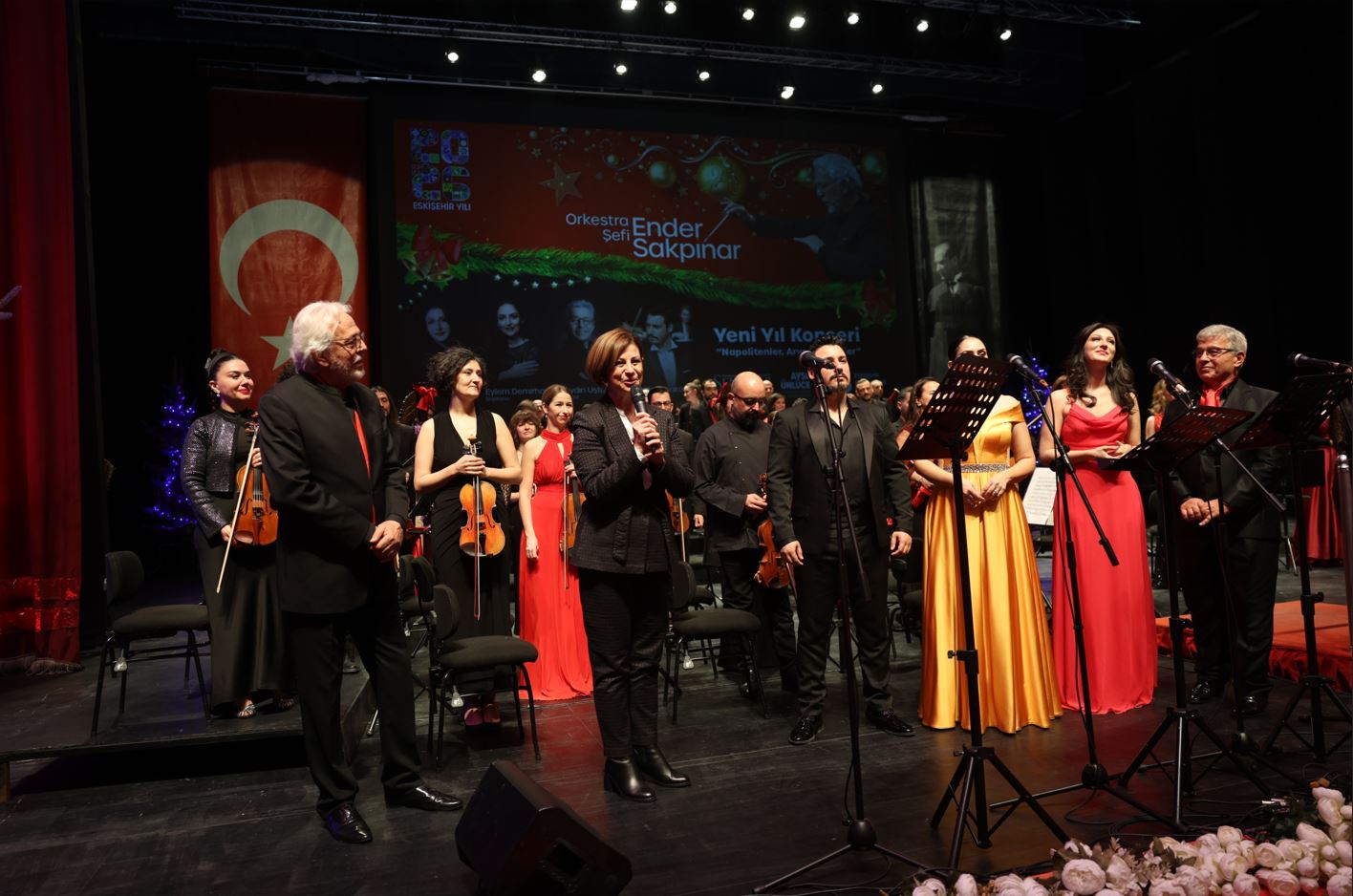 Konsere katılan Eskişehir Büyükşehir Belediye Başkanı Ayşe Ünlüce ise konuşmasında 2026’yı umutla karşıladıklarını vurgulayarak, “Yeni yıl konserimiz için bir aradayız. Üç gündür devam eden konserlerimizin bugün sonuncusunu gerçekleştiriyoruz ve bu gece bizim için çok özel. Eskişehir Büyükşehir Belediyemiz, ESKİ Genel Müdürlüğümüz ve bağlı kuruluşlarımızdaki çalışma arkadaşlarımızla bu güzel gecede birlikte olmak istedik. Bu akşam bizleri büyüleyen değerli konuk sanatçılarımıza ve solistlerimize teşekkür ediyor, alkışlarınızı rica ediyorum. Orkestramızı sık sık yöneten, birlikte olmaktan her zaman gurur duyduğumuz sevgili Orkestra Şefimiz Ender Sakpınar da bu gece bizimleydi. Kendisine teşekkür ediyorum. 2025 zorlu bir yıl oldu; ancak sanatın birleştirici ve iyileştirici gücüyle 2026’ya umutla giriyoruz. Diliyorum ki yeni yıl Eskişehir’e, ülkemize ve dünyaya barış, mutluluk ve başarı getirsin. Bu güzel gece için emeği geçen orkestramıza, solistlerimize ve tüm yol arkadaşlarımıza teşekkür ediyorum. İyi ki varsınız. 2026’da da hep birlikte Eskişehir için çalışmaya devam edeceğiz” şeklinde konuştu.