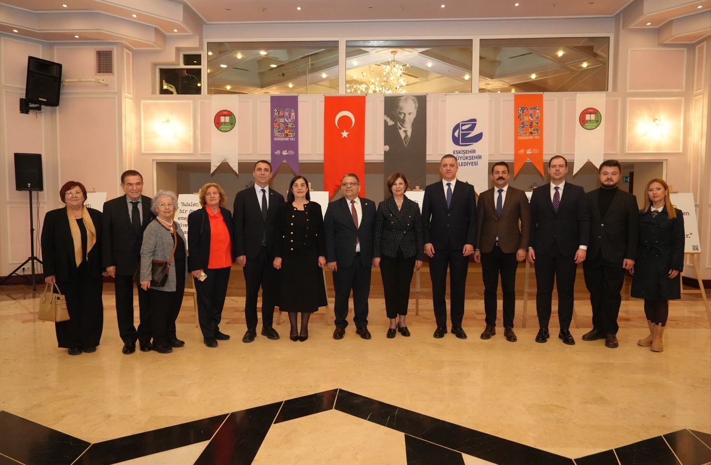 Türkiye Barolar Birliği Başkanı Erinç Sağkan ise konuşmasında adaletin toplumun en temel ihtiyacı olduğuna dikkat çekerek, Türkiye’de son dönemde yaşanan hukuki tartışmalara değindi. Anayasa Mahkemesi ve Avrupa İnsan Hakları Mahkemesi kararlarının uygulanmasına yönelik sorunlara işaret eden Sağkan, ifade özgürlüğü ve kişi güvenliği konularında yaşanan sıkıntıların adalet ihtiyacını daha da görünür kıldığını söyledi. Bu süreçte avukatların ve savunma makamının kritik bir rol üstlendiğini belirten Sağkan, Eskişehir Barosu’nun bu alandaki mücadelesine de özel olarak vurgu yaparak, “Bu ortamda sizlerle birlikte bulunmamıza vesile oldukları için hem Büyükşehir Belediye Başkanımıza hem de Baro Başkanımıza şükranlarımı sunarak başlamak istiyorum. 2026 yılının Eskişehir yılı olarak ilanı simgesel olarak çok anlamlı olmakla birlikte; 5 meydan muharebesinin 3'ünün gerçekleştiği bu topraklar aslında hepimiz açısından her yıl, her yılın şehri olarak kabul edilen bu şehrin kadim topraklarında bulunmaktan da çok büyük onur duyduğumu ifade etmek istiyorum” diye konuştu. Büyükşehir Belediye Başkanı Ayşe Ünlüce de 2026 yılını “Eskişehir Yılı” ilan ederek kentin ekonomik, kültürel ve sosyal hayatına katkı sunmayı hedeflediklerini ifade etti. Sergi fikrinin Eskişehir Barosu tarafından ortaya konduğunu ve büyük bir heyecanla desteklediklerini belirten Ünlüce, adalet kavramının yalnızca yargı ile sınırlı olmadığını, yerel yönetimlerden günlük yaşama kadar her alanda hissedilmesi gerektiğini söyledi. Eskişehir Barosu ile iş birliğinin artarak devam edeceğini dile getiren Başkan Ünlüce, “Aslında benim Büyükşehir Belediyesi ile ilk temasım Eskişehir Barosu'nun yönetim kurulu üyesiyken ve Kadın Hakları Komisyonu Başkanı iken oldu. O dönemde baro olarak Kadın Danışma ve Dayanışma merkezini kurmak için harekete geçtiğimizde, ilk kapısını çaldığımız Eskişehir Büyükşehir Belediyesiydi. O nedenle Eskişehir Barosu ve Büyükşehir Belediyesi birlikte çalıştığı, ürettiği, daha adil, daha eşit, daha özgür bir dünyaya, bir şehre inancıyla birlikte pek çok faaliyeti harekete geçirdi. Bu da bunlardan bir tanesi ve artarak, çoğalarak devam edecek” şeklinde konuştu.