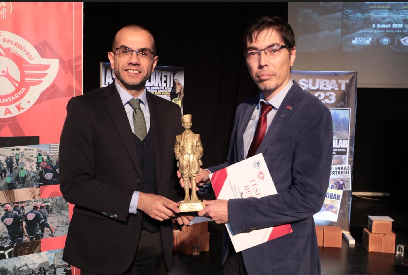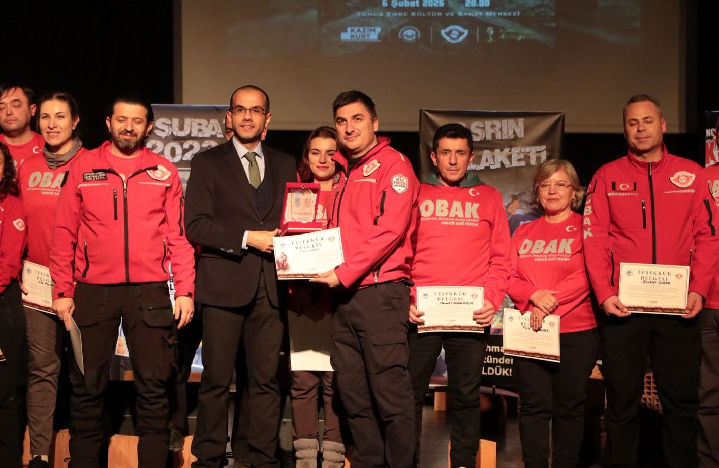Ortak acıyı paylaşmak, geçmişten dersler çıkarmak ve geleceğe dair sorumlulukları konuşmak amacıyla düzenlenen gecede, Doç. Dr. Muammer Tün “Geçmişten ders çıkaran deprem dirençli kent olmak” başlıklı sunumuyla, depremler sonrası kentlerin daha güvenli ve dayanıklı hale gelmesi için atılması gereken adımlara dikkat çekti. Programda söz alan OBAK Ekip Lideri Ercan Temel ile ekip lider yardımcısı Oktay Demirel, doğal afetlerle mücadelede sahada yaşadıkları deneyimleri ve 6 Şubat depremlerine dair unutulmayan anılarını paylaştı; anlatılanlar salonda zaman zaman duygusal anlar yaşanmasına neden oldu. Odunpazarı Belediye Başkan Yardımcısı Emre Genç ise konuşmasında, 6 Şubat depremlerinin yalnızca bir tarih değil, toplumsal hafızada derin bir yara olduğunu vurguladı. Dayanışmanın ve yerel yönetimlerin afetlere hazırlık konusundaki sorumluluğunun altını çizen Genç, kaybedilen canları unutmadan, daha güvenli kentler için birlikte çalışmanın bir vicdan borcu olduğunu ifade etti. Gecede ayrıca müzik ve şiirle duygulara dokunuldu. Sunuculuk Atölyesi eğitmeni Mercan Serpil Vurucu ile atölye üyeleri Seher Pehlivanoğlu, Güneş Kula Sara, Kürşat İlhan, Alper Yörük ve İlhan Göksu şiir dinletisi sundu; Gönül Onar, Hülya Düzbaş ve Ergün Elibaş solist olarak sahne alarak kaybedilen canları şarkılarla andı.