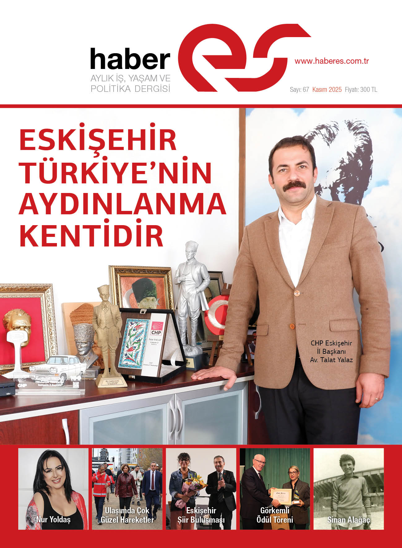 Eskişehir siyasetinin yükselen ismi olan CHP İl Başkanı Talat Yalaz, Haberes Dergisi’nin 67’nci sayısına konuk oldu. Eskişehir Siyasetinin son yıllarda yükselen ismi CHP Eskişehir İl Başkanı Av. Talat Yalaz Haberes Dergisi’nin 67’nci sayısına konuk oldu Yalaz; “Eskişehir halkı demokrat, aydın, çalışkan ve kent kültürüne sahip çıkan bir topluluk. Değişime açık, haksızlığa karşı duyarlı, çağdaş değerleri benimsemiş bir yapısı var. Bu nedenle Eskişehir, Türkiye’nin aydınlanma kentidir” dedi. Eskişehir Büyükşehir Belediye Başkanı Ayşe Ünlüce, kent içi trafiği rahatlatmak ve ulaşımı daha güvenli hale getirmek için kavşak düzenlemeleri, yeni bağlantı yolları yaparken; ‘Yeşil Dalga’ uygulamasını yaygınlaştırdı. Ünlüce’nin yıllardır yaşanan bu trafik çilesine neşter vurması Eskişehirlilerin takdirini topluyor. Ulaşımda yapılan yeni düzenlemeler; “Ayşe Ünlüce’den Kent Trafiği İçin Çok Güzel Hareketler” başlığı altında Dergimizin 67’nci sayımızda geniş şekilde yer alıyor. Tepebaşı Belediyesi’nin düzenlediği 13. Uluslararası Eskişehir Şiir Buluşması, Özdilek Sanat Merkezi’nde düzenlenen törenle başladı. Üç gün süren etkinlik şairleri ve şiir severleri buluşturdu. Etkinliğin Açılışında konuşan Başkan Ataç: “Şiir daima insan ruhuna dokunur, bizi birbirimize yakınlaştırır” dedi. Tepebaşı’nın her yıl başarıyla düzenlediği bu etkinliğin tüm detayları Haberes Dergisi’nin 67’nci sayımızda olacak. Eskişehir Odunpazarı Belediyesi ile Tekin Yayınevi tarafından düzenlenen Doğan Avcıoğlu Ödülleri, bu yıl dördüncü kez sahiplerini buldu. Türkiye’nin düşünce hayatına derin bir iz bırakan yazar, gazeteci ve aydın Doğan Avcıoğlu’nun adını yaşatmak amacıyla verilen ödüller, eleştirel düşünce geleneğini, kamucu bakışı ve toplumsal sorumluluk anlayışını onurlandırmayı sürdürüyor. Son sayımızda Odunpazarı’ndaki bu görkemli ödül törenine geniş yer verdik. Seslendirdiği Sultaniyegâh şarkısıyla Türk Pop Müziğinin efsanesi olan Nur Yoldaş Haberes’in 67’nci sayısına konuk oldu. Yoldaş; “Günümüz müziği de dâhil tüketim toplumu içindeyiz. Bu toplum için de tabii ki müzik de yerini bulacak. Biraz da hızla ilgili aslında. Yani insanlar artık eğlenmek, coşmak, keyif almak, hoplamak, zıplamak istiyor. Gam keder tasa istemiyor açıkçası” dedi. Bugün bir atölyenin içinde, ahşabın esanslı kokusu ve ince bir zımpara sesinin eşlik ettiği dingin bir atmosferde buluyoruz kendimizi. Bu dünyanın merkezinde, Lutiye Kâmil Gül, yıllardır ahşabı sese dönüştüren bir sanatkâr olarak çalışıyor. Kamil Gül; “Çalgı yapımcılığı, herkesin aynı malzemelerle başladığı ama kimsenin aynı sonuca ulaşamadığı bir zanaattır” dedi. Eskişehirspor’un Büyük Önder Mustafa Kemal Atatürk’ün tarif ettiği gibi; ‘zeki çevik ve ahlaklı efsanesi’ Sinan Alağaç henüz 25 yaşındayken, 40 yıl önce 24 Kasım 1985’de vefat etti. Ayhan Aydıner 40’ncı ölüm yıldönümünde siz Haberes okurları için Sinan Alağaç’ı yazdı. Eskişehir Spor Basınının Araştırmacı ismi Osman Cemoğlu, Eskişehirspor’un kuruluşundan bugüne görev almış teknik direktörlerini kaleme aldı. Eskişehirspor’un 60 yıllık tarihinde (1965-2025) 68’i Türk, 11’i yabancı (6 Yugoslav, 3 Romen, 1 Belçika ve 1 Alman) olmak üzere toplam 79 teknik adam farklı dönemlerde 116 kez görev yaptı. Birbirinden seçkin yazarlarımız; Ayça Ballı, İsmet Beceriklican, Sedat Halaç, İbrahim Bal, Ferit Oktaş. Cem Aksu ve Astrolog Handan Erkol Oran kaleme aldıkları birbirinden güzel makaleler Kasım 2025 sayımızda yer alıyor. Usta Karikatürist Ekrem Borazan yine muhteşem bir eseri sizler için çizdi. Diğer sayılarımız gibi 67’nci sayımızı da beğeneceğinizi umuyorum.