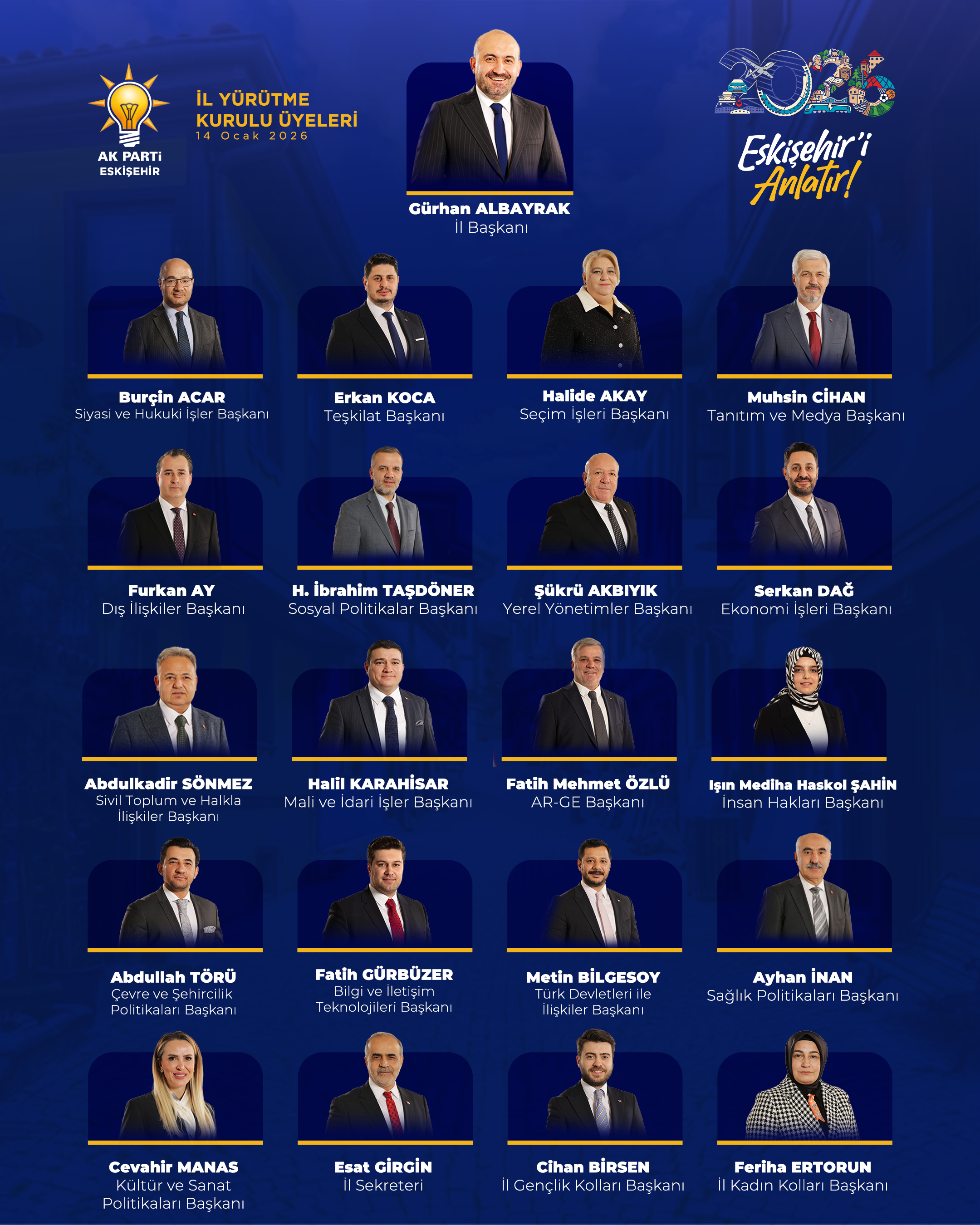 İl Başkanı Gürhan Albayrak başkanlığındaki yeni İl Yürütme Kurulu, 14 Ocak 2026 tarihi itibarıyla kamuoyuyla paylaşıldı.