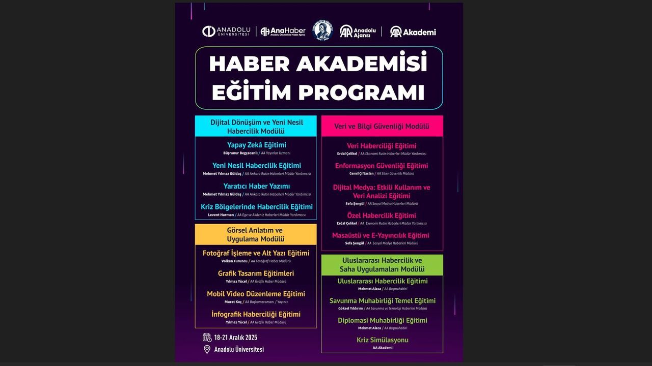 “Haber Akademisi Eğitim Programı”nın açılışı Anadolu Üniversitesi İletişim Bilimleri Fakültesi Şener Şen Salonu’nda gerçekleştirilecek. Program, İBF Frig Salonu’nda devam edecek. Eğitim programı kapsamında Anadolu Ajansı’nın alanında uzman isimleri tarafından, güncel medya pratiklerinin yanı sıra habercilikte öne çıkan yeni stratejik alanları kapsayan kapsamlı eğitimler verilecek. Dört gün sürecek eğitim programında; yapay zekâ, veri haberciliği, kriz bölgelerinde gazetecilik, dijital ve sosyal medya haberciliği, fotoğraf ve grafik tasarım, mobil video düzenleme ile savunma ve diplomasi muhabirliği gibi başlıklar ele alınacak.
