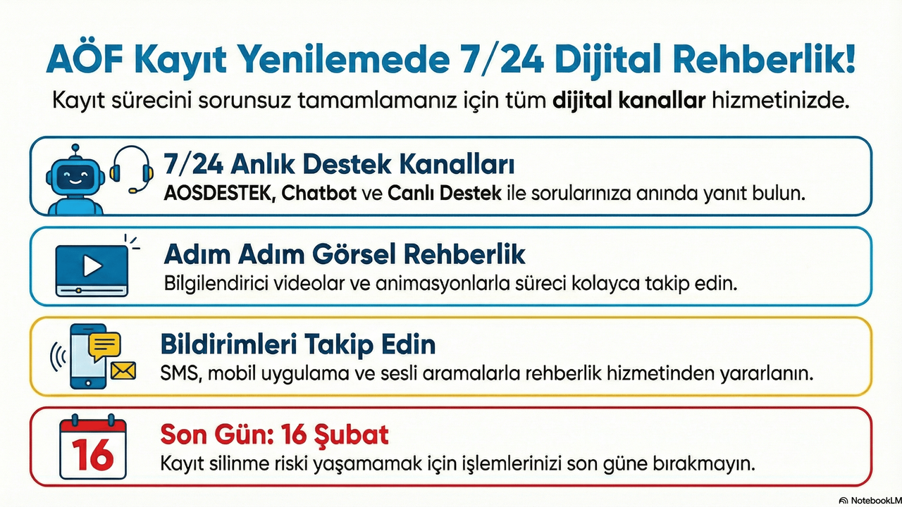 Kayıt yenileme sürecinin sorunsuz bir şekilde tamamlanması amacıyla öğrenciler, işlemlerini gerçekleştirirken takıldıkları her noktada; sesli yanıt sistemi, canlı destek hizmeti sunan çağrı merkezi, soru-cevap platformu AOSDESTEK ve yapay zekâ tabanlı sanal asistan Chatbot aracılığıyla anlık yardım alabiliyor. Sürecin daha şeffaf ve anlaşılır olması için hazırlanan bilgilendirici video ve animasyonlar da fakültenin resmi kanallarında yayına alındı. Ayrıca üniversite; SMS, mobil uygulama bildirimleri ve sesli aramalarla öğrencilere adım adım rehberlik ederek kayıt sürecini kolaylaştırmayı hedefliyor.