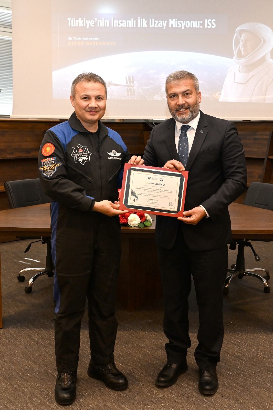“Türkiye’nin İnsanlı İlk Uzay Misyonu: ISS” söyleşisinin açılış konuşmasını yapan Anadolu Üniversitesi Rektörü Prof. Dr. Yusuf Adıgüzel şunları söyledi: “Yüksek bir teknoloji ve sarsılmaz bir azimle bilimle inancın harmanlandığını görüyoruz. Sayın Gezeravcı’nın gerçekleştirdiği uzay yolculuğu, sadece kişisel bir seyahat ya da sınırların aşılması değildir; aynı zamanda özgüvenimizin, merakımızın ve ‘kendini bilme’ yolculuğumuzun önemli bir aşamasına ulaştığımızın da göstergesidir. Sayın Gezeravcı, ay yıldızlı bayrağımızı yer çekimsiz ortamda dalgalandıran ilk kişi olarak gurur kaynağımızdır. Kendisi aynı zamanda her birimizin hayallerini de o yüksekliğe taşıdı. Bu tarihi başarıyla bizlere büyük bir gurur yaşatan Sayın Alper Gezeravcı’ya, ülkemizin bilim ve teknoloji yolculuğuna yaptığı değerli katkılar için kendim, sizler ve Üniversitem adına gönülden teşekkür ediyorum. Kendisini Üniversitemizde ağırlamaktan büyük mutluluk duyuyor, tekrar hoş geldiniz diyorum.”