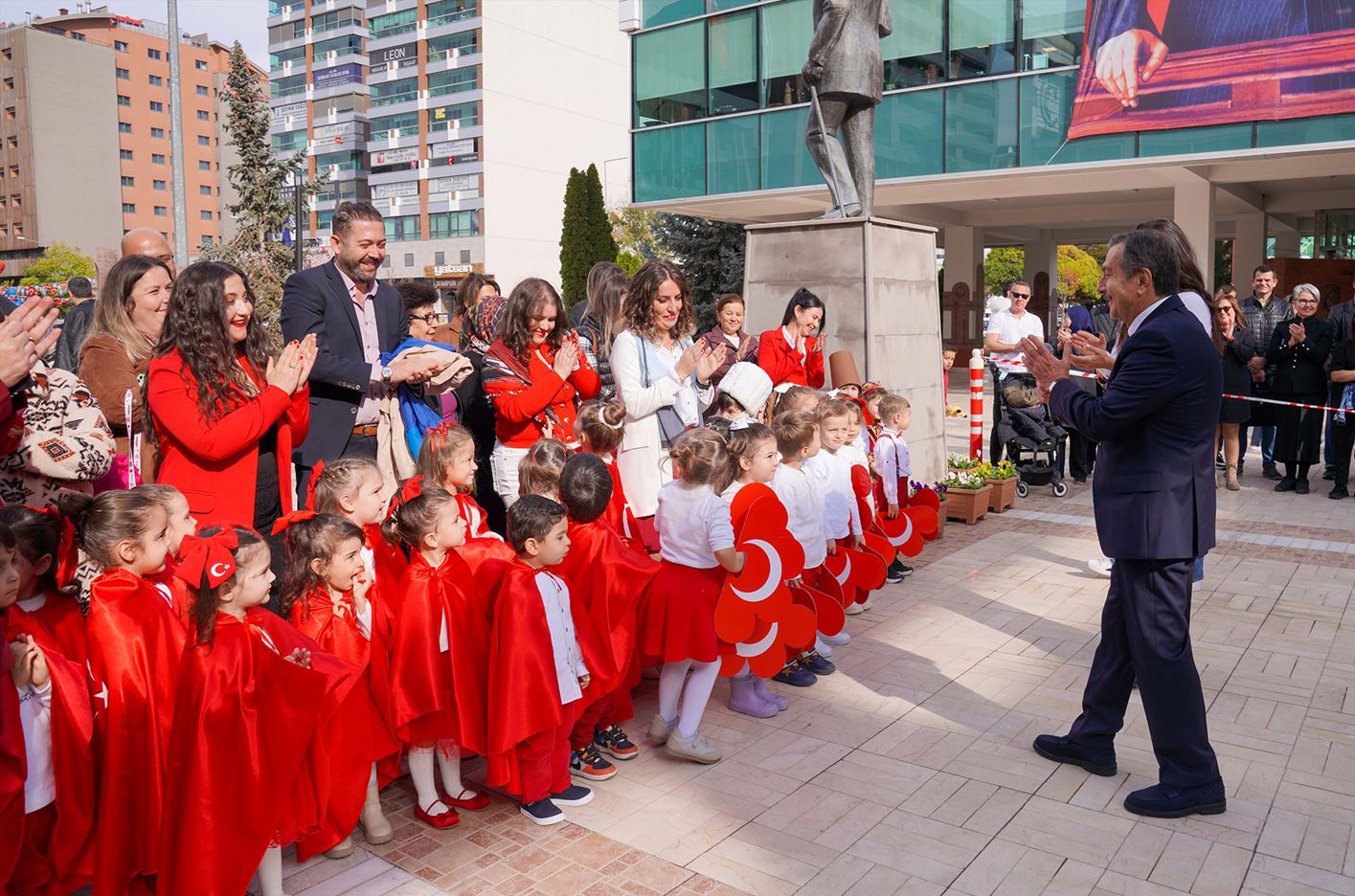Çocukların coşkusunu paylaşan Tepebaşı Belediye Başkanı Dt. Ahmet Ataç da bir konuşma yaparak, “Bugün bu topraklarda yaşayan tüm insanların gururla kutlayacağı bir bayram. Çünkü bu büyük başarı: 102 yıl önce büyük kurtarıcı Mustafa Kemal Atatürk ve silah arkadaşlarının Samsun’daki buluşmaları ile orada yapılan kongreler ile birlikte İnönü savaşları, büyük taarruz ve İzmir’in kurutuluşuyla birlikte düşmanı topraklarımızdan atmasıdır. Ardından 29 Ekim 1923’te Cumhuriyeti ilan ediyor. Bugünlere kadar gelmemizde, bu topraklarda yaşamamızda, nefes almamızda en büyük hediye olan Cumhuriyetimizdir. Cumhuriyetimizin de gelecek nesiller tarafından da iyi korunması en büyük hedefimizdir. Cumhuriyet sadece yönetim biçimi değil, bize verilen özgürlüktür, eşitliktir, aydınlıktır. Nice yıllara yine Cumhuriyetimizle yaşayacağız ve Cumhuriyetimizi ilelebet koruyacağız. Bunu sağlayan başta Mustafa Kemal Atatürk ve silah arkadaşlarına borçluyuz. Ne mutlu Türküm, ne mutlu Atatürkçüyüm. Çocuklar sizlere de teşekkür ediyorum: sizleri gördükçe umudum artıyor. İyi ki varsınız.” sözlerini kullandı.