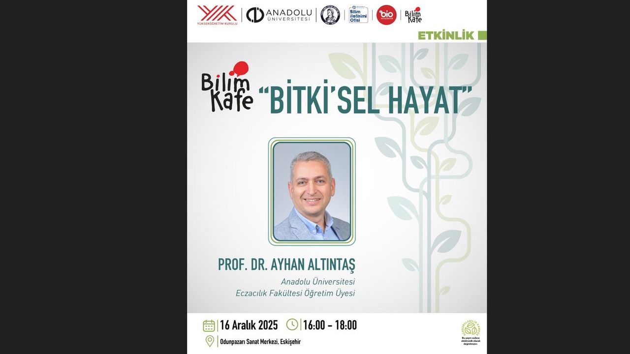 Anadolu Üniversitesi Bilim İletişimi Ofisi tarafından hazırlanan “Bilim Kafe” söyleşileriyle Eskişehir halkıyla buluşuyoruz. 16 Aralık Salı günü saat 16.00’da Odunpazarı Sanat Merkezi’nde Eczacılık Fakültesi Öğretim Üyesi Prof. Dr. Ayhan Altıntaş, “Bitki’sel Hayat” başlıklı sunumuyla bitkilerin yaşamımızdaki yerini ve taşıdığı önemi Eskişehir halkıyla paylaşacak.