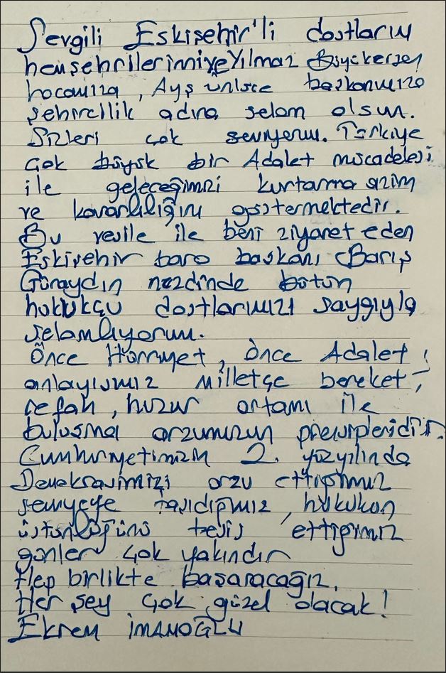 Günaydın ziyarette uzun uzun sohbet ettiği Ekrem İmamoğlu'nun moralinin iyi olduğunu söyledi. İmamoğlu, Barış Günaydın aracılığıyla Eskişehir'e mektup gönderdi. İmamoğlu gönderdiği mektupta şunları söyledi; "Sevgili Eskişehirli dostlarım, hemşehrilerimize ve Yılmaz Büyükerşen hocamıza, Ayşe Ünlüce başkanımıza şehircilik adına selam olsun. Sizleri çok seviyorum. Türkiye çok büyük bir adalet mücadelesi ile geleceğimizi kurtarma azim ve kararlılığını göstermektedir. Bu vesile ile beni ziyaret eden Eskişehir Baro Başkanı Barış Günaydın nezdinde bütün hukukçu dostlarımızı saygıyla selamlıyorum. Önce Hürriyet, önce Adalet anlayışımız milletçe bereket, refah, huzur ortamı ile buluşma arzumuzun prensipleridir. Cumhuriyetimizin 2. Yüzyılında demokrasimizi arzu ettiğimiz seviyeye taşıdığımız, hukukun üstünlüğünü tesis ettiğimiz günler çok yakındır. Hep birlikte başaracağız. Her şey çok güzel olacak!"