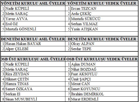 Konuşmaların ardından oylama işlemine geçildi. Gerçekleşen seçim sonrası Eskişehir OSB Yönetim Kurulu Başkanı Nadir Küpeli, yeniden başkanlığa seçilirken, yeni yönetim ve denetim kurulu şu isimlerden oluştu: