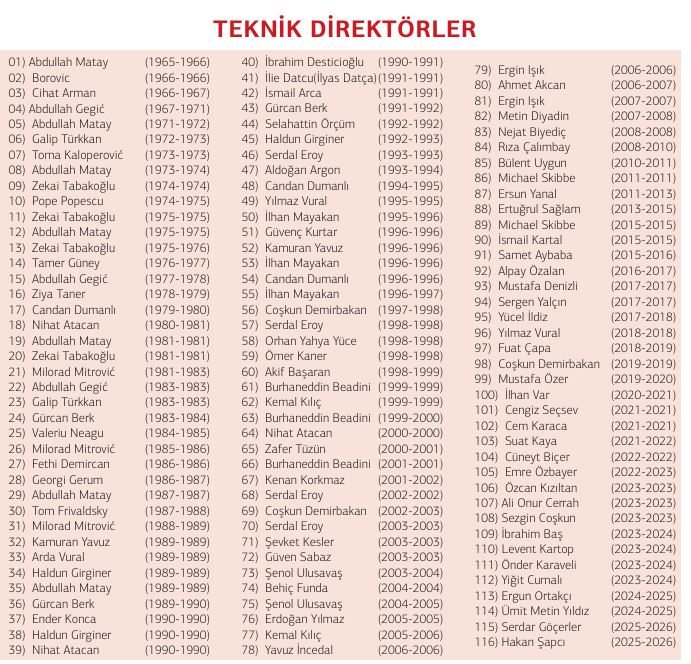 Bunların arasında takımın ilk Teknik Direktörlüğünü de yapan Abdullah Matay 7 kez ayrı dönemlerde görev yaparak kırılması zor bir rekorun da sahibi oldu. Ayrıca Zekai Tabakoğlu’da 4 farklı dönemde görev yapan Teknik Direktör olarak kayıtlara geçti…