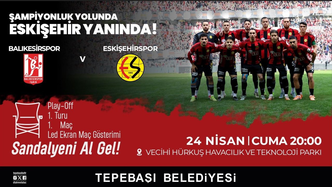 Tepebaşı Belediyesi Vecihi Hürkuş Havacılık ve Teknoloji Parkı’nda kurulacak dev ekranda yayınlanacak mücadele, Eskişehirlileri tek yürek olmaya çağırıyor. Taraftarlar, kendi sandalyelerini alarak alana gelebilecek ve bu önemli karşılaşmayı birlikte izleme fırsatı bulacak.
