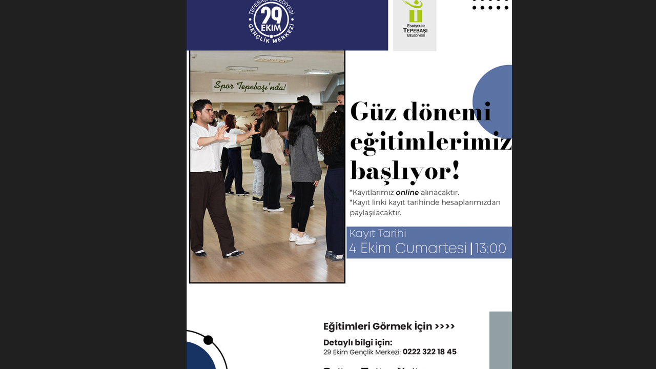 Tepebaşı Belediyesi, her yıl on binlerce kişinin faydalandığı 29 Ekim Gençlik Merkezi ile gençlerin gelişimine destek olmayı ve geleceklerine katkı sağlamayı sürdürüyor. 29 Ekim Gençlik Merkezi tarafından gerçekleştirilecek güz dönemi eğitimleri için kayıtlar, 4 Ekim Cumartesi günü saat 13.00’te online olarak alınacak. Ücretsiz olarak düzenlenecek eğitimler arasında gençler için birçok seçenek bulunuyor. Merkezde gerçekleşecek eğitimler arasında; Rusça A1, İngilizce speaking A1-A2, İngilizce gramer A1-A2, İngilizce Speaking Intermediate (orta seviye), temek işaret dili, temel fotoğrafçılık atölyesi, fotoğraflı hikaye anlatıcılığı, temel yazılım (kodlama ve veri yönetimi), bilinçaltı ve kişisel gelişim atölyesi, resim dersi, bağlama, klasik gitar, satranç ve analitik düşünme, Go (strateji oyunu), salsa, bachata, solo jazz, aikido, nefes eğitimi, yoga, pilates, zumba ve tango yer alıyor.