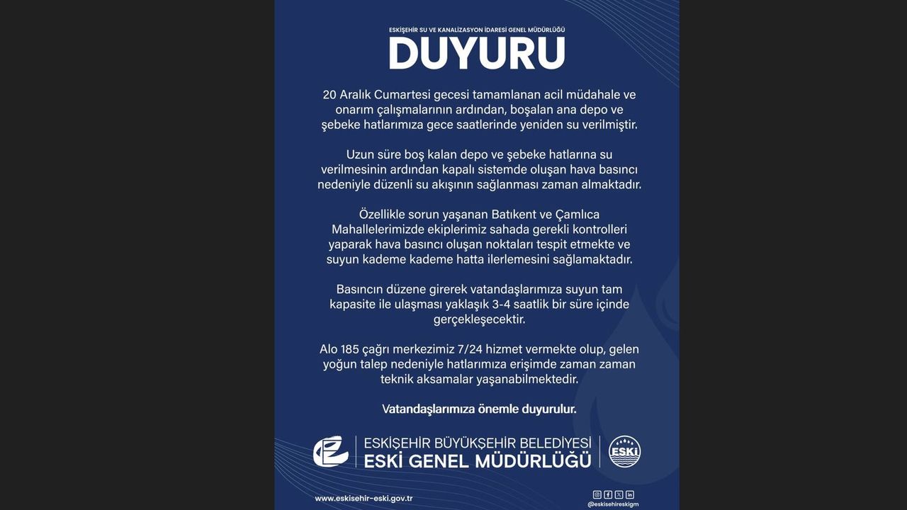 Yapılan duyuruda şu ifadeler kullanıldı: "Uzun süre boş kalan depo ve şebeke hatlarına su verilmesinin ardından kapalı sistemde oluşan hava basıncı nedeniyle düzenli su akışının sağlanması zaman almaktadır. Özellikle sorun yaşanan Batıkent ve Çamlıca Mahallelerimizde ekiplerimiz sahada gerekli kontrolleri yaparak hava basıncı oluşan noktaları tespit etmekte ve suyun kademe kademe hatta ilerlemesini sağlamaktadır. Basıncın düzene girerek vatandaşlarımıza suyun tam kapasite ile ulaşması yaklaşık 3-4 saatlik bir süre içinde gerçekleşecektir. Alo 185 çağrı merkezimiz 7/24 hizmet vermekte olup, gelen yoğun talep nedeniyle hatlarımıza erişimde zaman zaman teknik aksamalar yaşanabilmektedir. Vatandaşlarımıza önemle duyurulur."