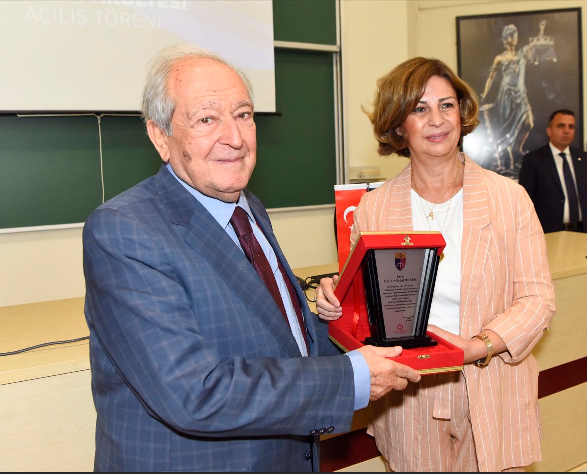 Törende, Bilkent Üniversitesi Öğretim Üyesi Prof. Dr. Erdal Onar, “Devlet Kavramı” başlıklı açılış dersini verdi. Devletin doğuşuna ilişkin tanımlara, devletin unsurlarına (ülke, nüfus, kişilik ve egemenlik) değinen Onar, şu ifadeleri kullandı: “Devlet çok önemli bir kurumdur; hatta bir olgudur. Orio’nun tanımıyla ‘kurumlar kurumu’dur. Devlette insanlar yaşar; ama aynı zamanda kurumlar da vardır ve onlar da adeta yaşar. Yani devletin kendine özgü bir kişiliği ve oluşumu vardır. İnsan, toplum halinde yaşayan bir varlıktır. Hiç tanımadığınız, belki bir daha görmeyeceğiniz insanlarla aynı anda, aynı mekânda bulunuyorsunuz. Bu durumda nasıl bir düzen kuracaksınız? İşte toplu yaşamın belli bir düzen içinde sürdürülmesi gerekliliği burada ortaya çıkıyor. Bu düzenin adil olması gerekir. Adil düzeni sağlayacak yapılanma ise zamanla iktidar niteliğinden çıkarak otorite hâline gelir. Otorite, ideal bir devlette olması gereken buyurma gücüdür.” Tören, Prof. Dr. Erdal Onar’a Hukuk Fakültesi Dekanı Prof. Dr. Mesut Aygün tarafından hediye takdim edilmesiyle sona erdi. Açılış konuşmalarının ardından Hukuk Çalışmaları Uygulama ve Araştırma Merkezi (ANDHUMER) de hizmete açıldı.