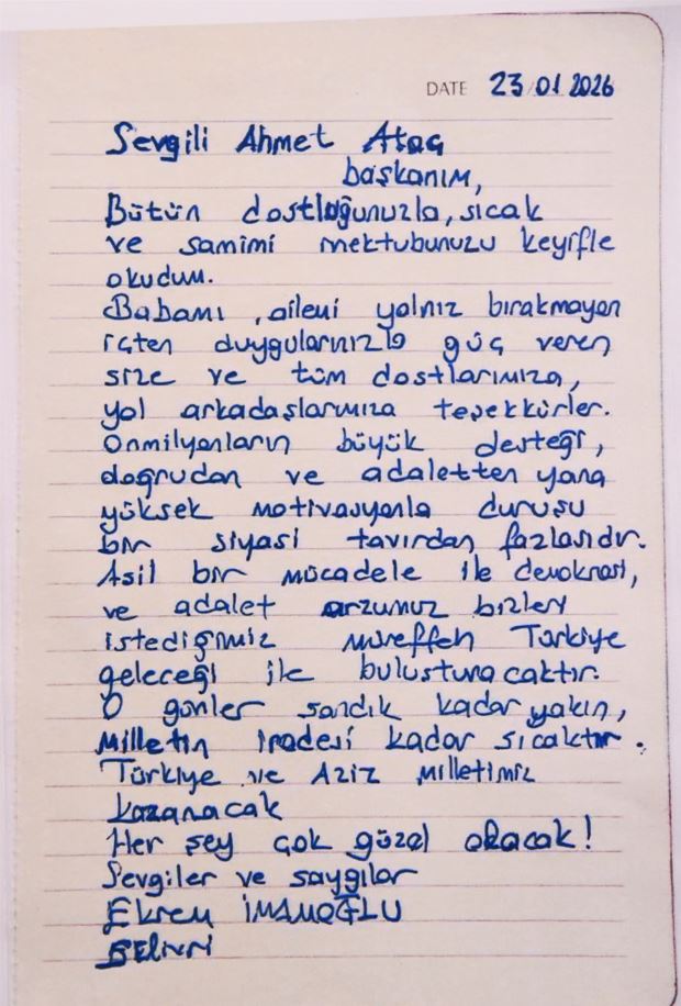 Mektubun içeriğine ilişkin açıklamada bulunan Başkan Ataç, Ekrem İmamoğlu’nun mesajının adalete ve demokrasiye duyulan sarsılmaz inancı yansıttığını vurgulayarak, dayanışma ve ortak mücadele kararlılığının altını çizdi. Ataç, “Bu mektup yalnızca bana değil, tüm Tepebaşı ve Eskişehir halkına hitap etmektedir” ifadelerini kullandı.