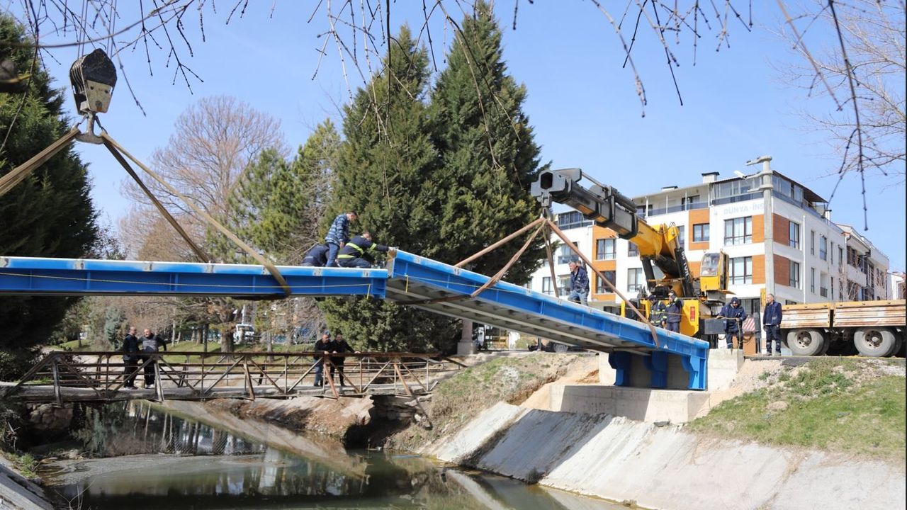 Büyükşehir Belediyesi Fen İşleri Dairesi Başkanlığı ile Park ve Bahçeler Dairesi Başkanlığı ekipleri, geçtiğimiz yıl hizmete açılan ve kısa sürede Eskişehirlilerin uğrak noktalarından biri haline gelen İskele 26’ya giden güzergâhta bulunan mevcut köprünün dar olması ve bölgedeki yoğun yaya trafiğini karşılayamaması nedeniyle yerine daha geniş ve yapısal olarak daha dayanıklı yeni bir köprü inşa ediliyor.