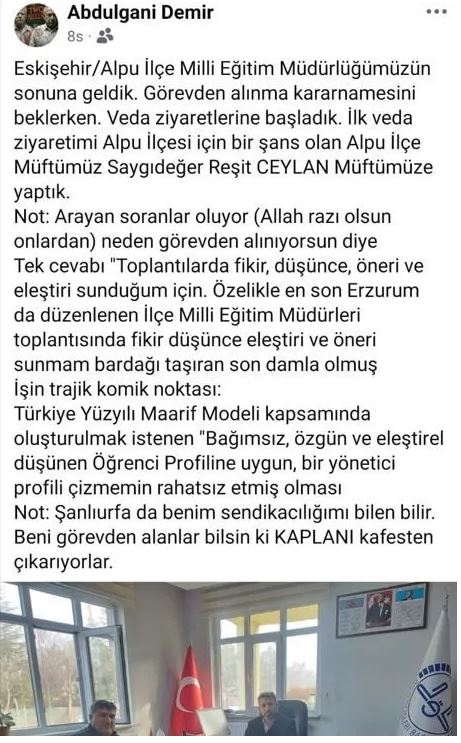 - Eskişehir İl Milli Eğitim Müdürümüz Sinan AYDIN Bey beni Eskişehir girişinde karşılamakla kalmadı, beni görevden alma sürecini başlattı.