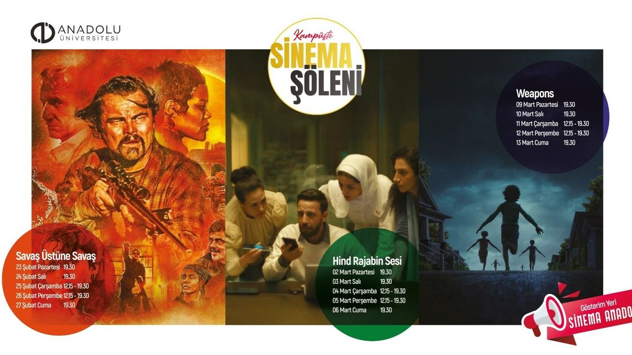 Birbirinden nitelikli filmlerin Anadolu Üniversitesi’nde izleyiciyle buluşacağı etkinlik kapsamında; 23, 24, 25, 26 ve 27 Şubat tarihlerinde Savaş Üstüne Savaş, 2, 3, 4, 5 ve 6 Mart tarihlerinde Hind Rajabin Sesi, 9, 10, 11, 12 ve 13 Mart tarihlerinde ise Weapons farklı seanslarla sinema perdesinde yer alacak.