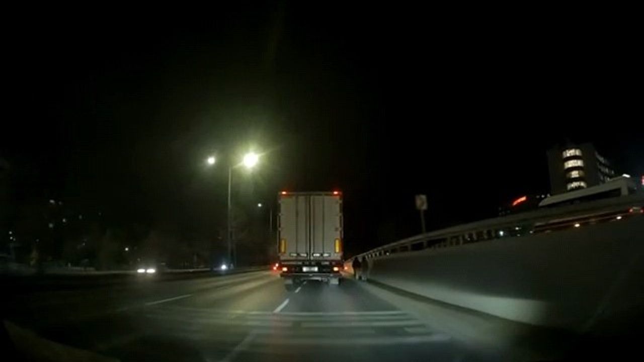 Ağır vasıta araçlarının ve otomobillerin yüksek süratle seyrettiği bölgede yürüyen şahısların, fark edilmelerini sağlayacak hiçbir reflektörlü kıyafet taşımamaları tehlikeyi iki katına çıkardı. O esnada yolda ilerleyen bir kamyon şoförü, karanlıkta adeta "görünmez" olan yayaları son anda fark etti. Şoförün dikkati ve ani manevrası sayesinde şahıslara çarpmaktan son saniyede kurtulduğu anlar, çevredeki vatandaşların kamerasına yansıdı.