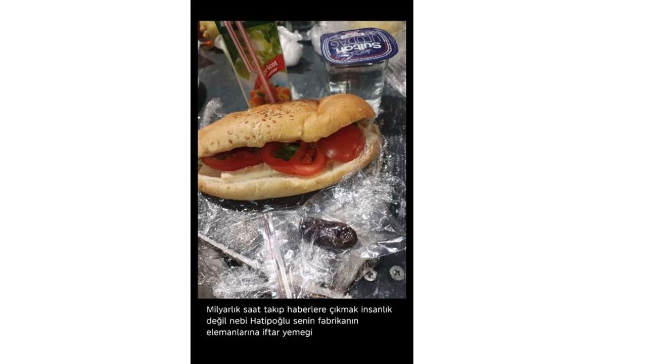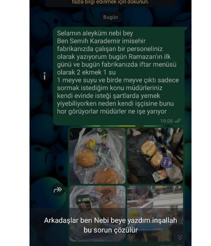 İşçilerin kendi sosyal medya gruplarında da dünkü iftar yemeği ile ilgili yapılan bir paylaşımda dikkat çekti. Paylaşımda şu ifadeler yer aldı; "Selamın aleyküm Nebi Bey. Ben Semih Karademir. İmişehir fabrikanızda da çalışan bir personeliniz olarak yazıyorum. Bugün Ramazan'ın ilk günü ve bugün fabrikanızda iftar menüsü olarak 2 ekmek, 1 su, 1 meyve suyu ve bir de mevye çıktı. Sadece sormak istediğim konu müdürlerinizin kendi evinde istediği şartlarda yemek yiyebiliyorken neden kendi işçisine bunu hor görüyor müdürler ne işe yarıyor" Karedemir; "Arkadaşlar ben Nebi beye yazdım. İnşallah bu sorun çözülür" diye bunu arkadaşlarıyla paylaştı. Bu paylaşım sonunda bugün işçilere bir meyve yerine ekmek arası domates peynir layık görüldü. İşçiler kendilerine layık görülen bu yemekleri mutfakta yiyemedikleri belirtildi. Poşetlerle alıp karton kutular üzerinde veya ayakta yiyerek; iftarlarını açtıkları iddia edildi.