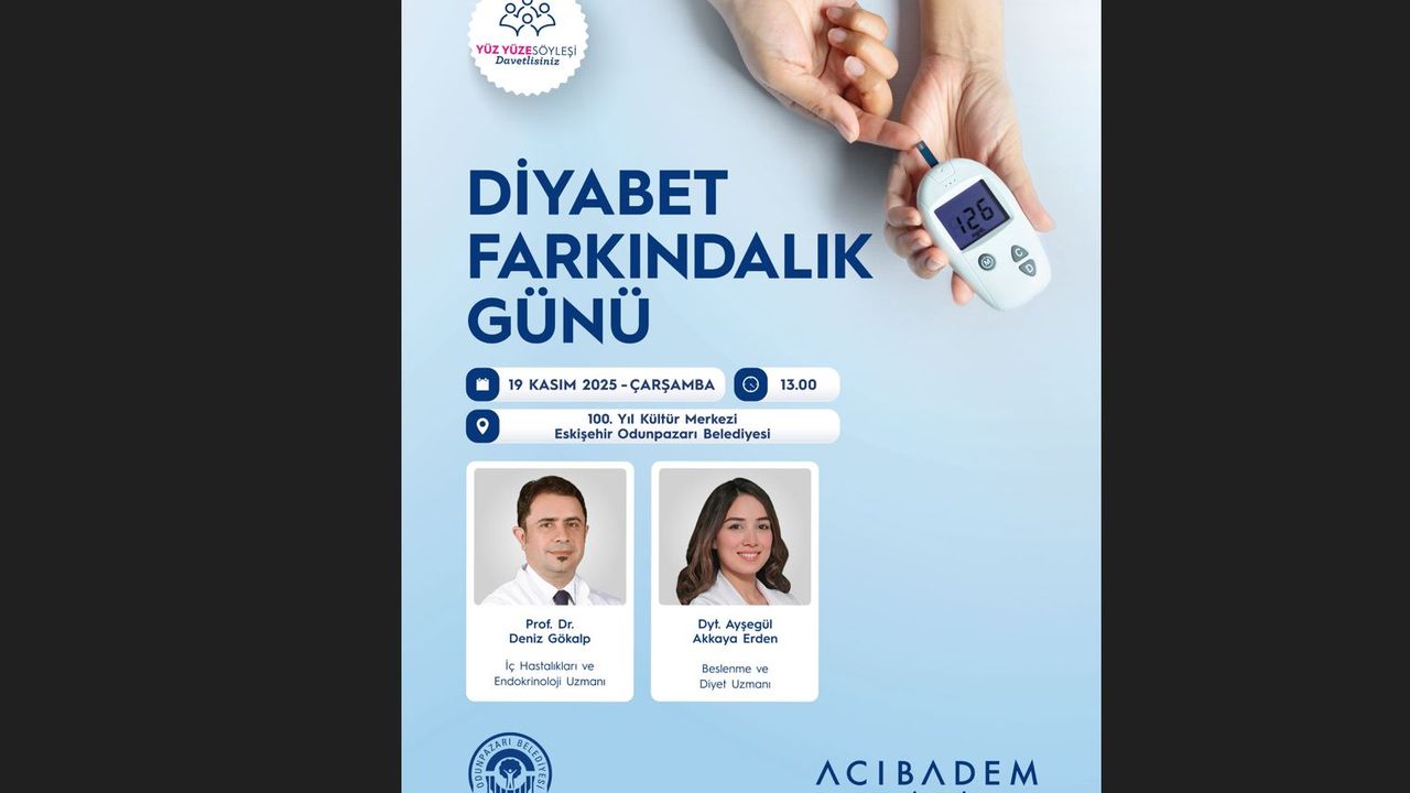 Diyabet Farkındalık Günü kapsamında gerçekleştirilecek söyleşi, 19 Kasım 2025 Çarşamba günü saat 13.00’te, Odunpazarı Belediyesi’nin 100. Yıl Kültür Merkezi’nde yapılacak. Etkinlikte, İç Hastalıkları ve Endokrinoloji Uzmanı Prof. Dr. Deniz Gökalp ile Beslenme ve Diyet Uzmanı Dyt. Ayşegül Akkaya Erden, diyabetin belirtileri, korunma yöntemleri, tedavi süreçleri ve beslenme önerileri üzerine kapsamlı bilgiler paylaşacak. Hem diyabet hastaları hem de diyabet riski taşıyan bireyler için yol gösterici nitelikte olacak bu yüz yüze söyleşi, bilinçlenmeyi artırmayı ve toplum sağlığına katkıda bulunmayı amaçlıyor. Odunpazarı Belediyesi ile Acıbadem Hastanesi’nin ortak çalışmasıyla düzenlenen etkinlik, ücretsiz olarak tüm katılımcılara açık olacak.