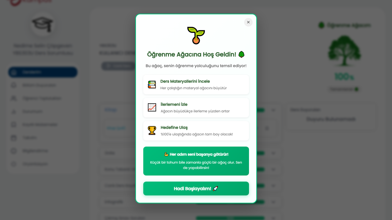 Açıköğretim Fakültesi Dekanı Prof. Dr. Aras Bozkurt’un önderliğinde geliştirilen Öğrenme Ağacı uygulaması, öğrencilerin ders materyallerini kullandıkça büyüyen bir ağaç metaforu üzerinden öğrenme ilerlemelerini görselleştiriyor. Böylece öğrenme süreci yalnızca sayısal bir yüzdeyle değil, gelişim ve emek kavramlarını temsil eden anlamlı bir metaforla ifade ediliyor.