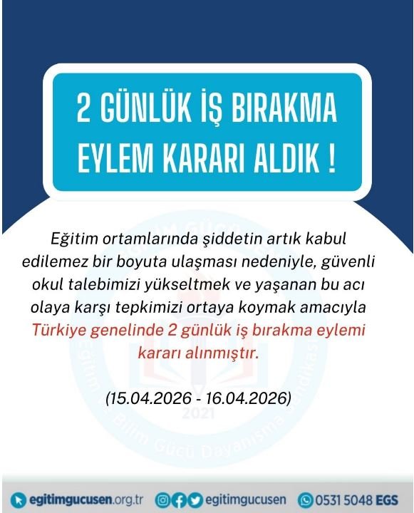 Eğitim Gücü Sen Yönetim Kurulu olarak can güvenliğimizin sağlanması, okulların daha güvenli hale getirilmesi ve tepkimizi göstermek için 15-16.04.2026 tarihlerinde iki gün (Çarşamba, Perşembe) iş bırakma eylem kararı aldık" dedi.