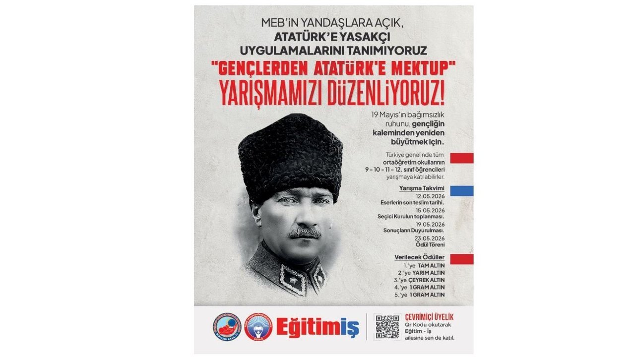 Eğitim İş Eskişehir Şube Başkanı Fadime Aydın Arslan; “Eğitim-İş olarak cumhuriyetimizin kurucusu Büyük Önder Mustafa Kemal Atatürk’ü anmak, ilke ve devrimlerini gelecek nesillere aktarmak amacıyla yıllardır 19 Mayıs Atatürk’ü Anma, Gençlik ve Spor Bayramı kapsamında düzenleyerek geleneksel hala getirdiğimiz "Gençlerden Atatürk’e Mektup" yarışmamız için gerekli belgeleri 18 Şubat 2026’da Milli Eğitim Bakanlığı’na ilettik” dedi.