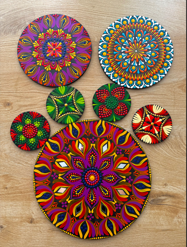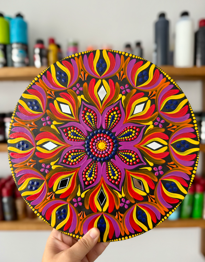 Mandala yaparken çok kapsamlı malzemelere gerek yok aslında. En temel ihtiyaç; düzgün bir yüzey, boyalar ve noktalama için kullanılan aparatlar. Noktalama için özel mandala kalemleri var ama başlangıçta kürdan, iğne başı ya da farklı kalınlıktaki çubuklar bile kullanılabiliyor. Boyama için genellikle akrilik boya tercih ediliyor. Hem canlı renkler veriyor hem de yüzeyde uzun süre dayanıklılığını koruyor. Ben özellikle taş, tuval ya da ahşap üzerine çalıştığım için akrilik boyayı uygun buluyorum.