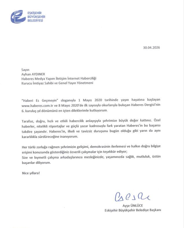 'Haberi Es Geçmeyin' sloganıyla 1 Mayıs 2020 tarihinde yayın hayatına başlayan www,haberes.com.tr ve 8 Mayıs 2020'de ilk sayısıyla okurlarıyla buluşan Haberes Dergisinin 6. kuruluş yıldönümünü en içten dileklerimle kutluyorum.