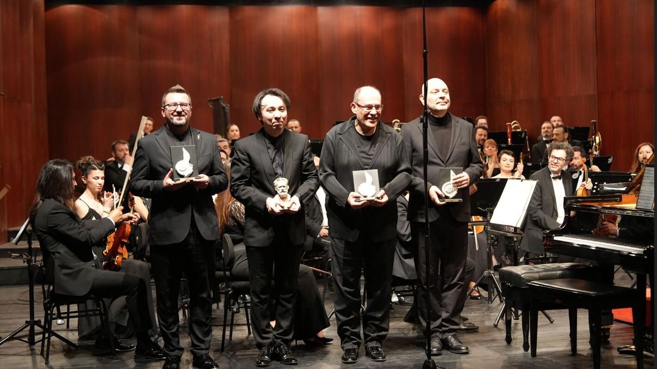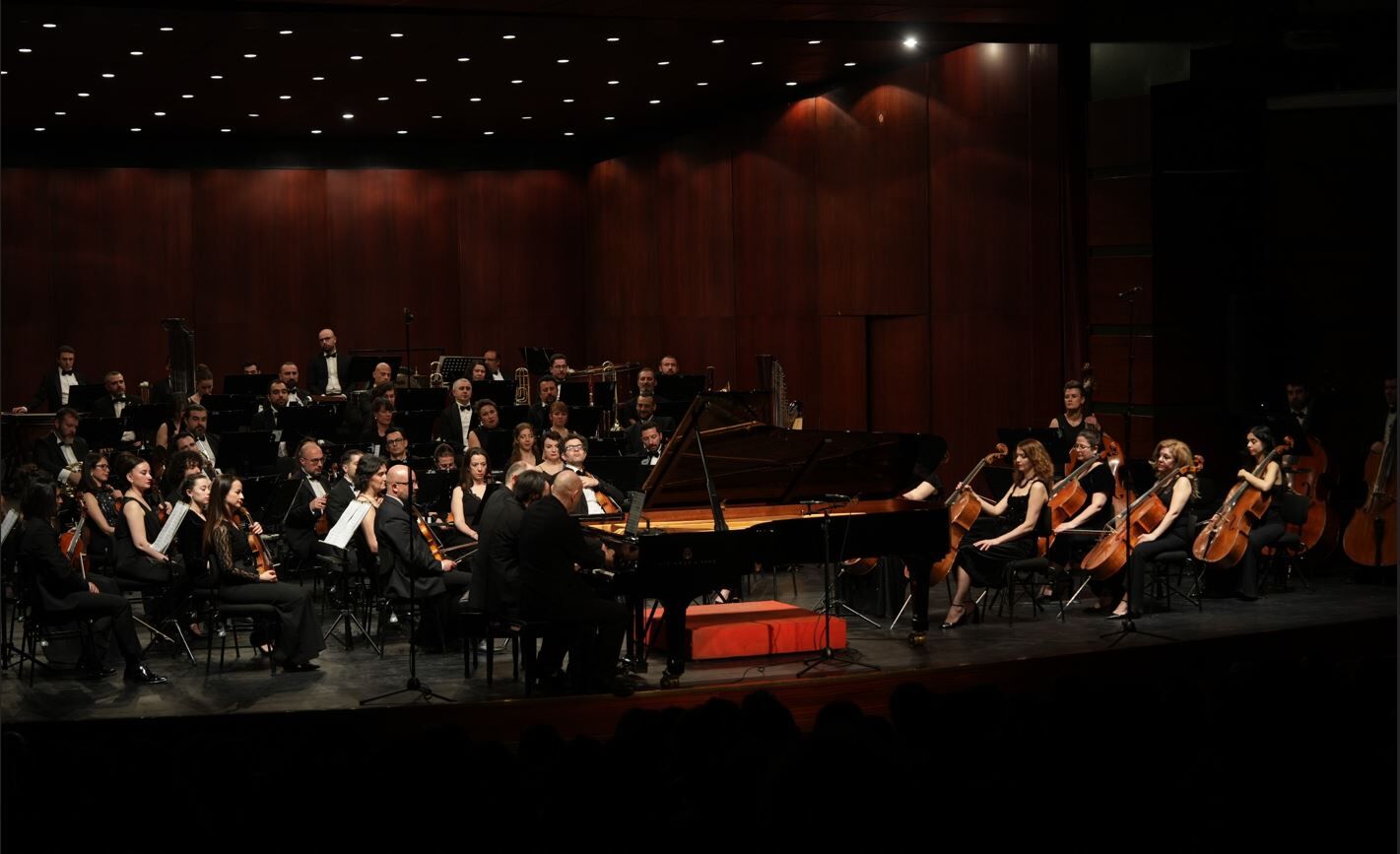 Ardından sahneye çıkan Muhiddin Dürrüoğlu, G. Gershwin’in klasik müzik ile cazı ustalıkla harmanlayan ve 20. yüzyılın en önemli eserlerinden biri olarak kabul edilen “Rhapsody in Blue” adlı yapıtını seslendirdi. Sanatçının teknik hakimiyeti ve yorum gücü, eserin karakteristik ruhunu dinleyicilere güçlü bir şekilde yansıttı ve büyük beğeni kazandı. Gecenin sonunda orkestra şefi Rustam Rahmedov, piyanistler Muhiddin Dürrüoğlu ve Özgür Aydın ile birlikte yeniden sahneye gelerek S. Rahmaninov’un altı el için yazdığı eseri seslendirdi. Bu keyifli bis performansı, konserin unutulmaz anları arasında yerini aldı. Tepebaşı Belediye Başkanı Dt. Ahmet Ataç da geceye katılanlar arasında yer aldı. Plaket takdiminin ardından unutulmaz konser sona erdi.