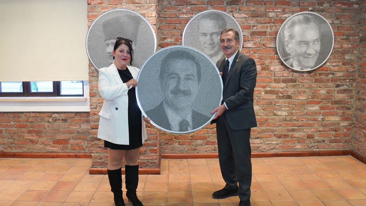 Edanur Yavaş yaptığı konuşmada, “Ulu Önder Mustafa Kemal Atatürk’ün izinde, onun ilke ve devrimlerinden aldığımız ilhamla; her bir ip, her bir düğüm ve her bir ilmek, aslında Cumhuriyetimizin emeğini, sabrını ve ışığını temsil ediyor. Proje ortağım Dilara Altıparmak ile sizlere hazırlamış olduğumuz bu 17 eser için büyük emekler harcadık. Bir çalışmamızda çeşitli ön hazırlık ve algoritmalarını oluşturduktan sonra 240 tane çivi ve 7 bin 200 metre saç telinden daha ince iplerle 4 bin 500 atım yaparak, altyapısında hiçbir çizim olmadan ilmek ilmek dokuyarak portrelerimizi oluşturduk. Bugün burada sergilenen her eser, sadece bir sanat ürünü değil aynı zamanda Cumhuriyet ile yoğrulmuş bir emeğin simgesidir.” diye konuştu.