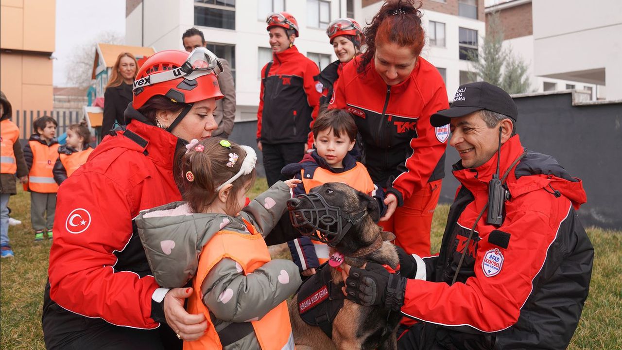 Minik öğrenciler, eğitim sırasında arama kurtarma köpeğiyle tanışma fırsatı da buldu. Çocukların ilgisini çeken buluşmada, arama kurtarma köpeğinin görevleri anlatıldı.