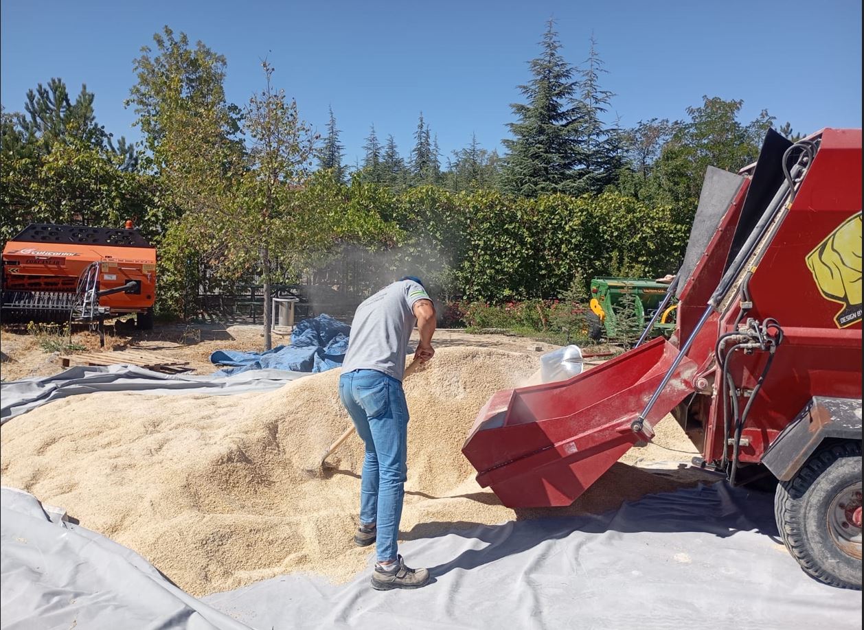 Hasat edilen ürünler belediye imkânlarıyla kırılıp uygun oranlarda karıştırılarak çuvallandı. Kaba yem ve küspe ile birlikte kullanılabilecek bu karışım, dağıtıma hazır hale getirildi.